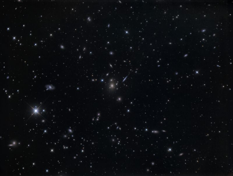 Mir wird bei diesen kosmischen Dimensionen fast schwindelig. Deshalb halte ich mich lieber an die Schönheit und Tiefe des Bildes und den vielen Galaxien, die auf ihm zu erkennen sind. Rings um die zentrale Galaxie sind auch drei Quasare. Einer von ihnen hat eine Lichtlaufzeit von etwa 12 Milliarden Jahren. Wir können also auch auf diesem Bild quasi bis ans "Ende der Welt" blicken. Dort ist nur noch das Radio-Abbild des Urknalles (oder was es auch immer war) zu entdecken, was aber meinem optischen Teleskop völlig verborgen bleibt.