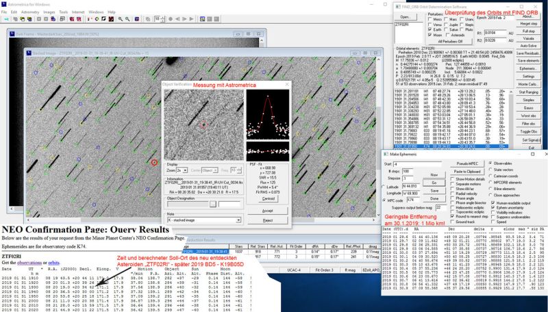 Die Vermessung der Aufnahmen erfolgte mit dem Programm Astrometrica von Herbert Raab (links oben). Bei 16 gestackten Aufnahmen auf die Bewegung des Asteroiden (100 Sekunden Belichtungszeit) war er deutlich zu erkennen. Das Signal / Rauschverhältnis war gut mit über 15, die FWHM betrug leidliche 5,4“. Eine Überprüfung der gemessenen Position erfolgte über das Programm FIND-ORB (rechts). Es errechnet aus den eingegebenen Positionen einen Orbit, die Bahndaten und die Abweichungen von Messungen von der besten berechneten Bahn. Zudem kann mit dem Programm weitere Ephemeriden berechnet werden, die auch den Abstand des Asteroiden von der Erde angeben. Am Morgen des 30.1.2019 waren es nur 1,1 Million km (0,0073 Astronomische Einheiten)! Aber da war der Asteroid noch gar nicht entdeckt!