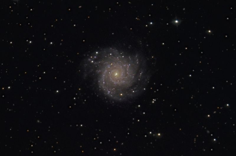 Die schwachen Nebelfleckchen im weiteren Bildfeld sind Galaxien, die weit hinter der etwa 30 Millionen Lichtjahre entfernten M74 liegen. Nach Größe und Helligkeit dürfte ihre Distanz bei einer Milliarde Lichtjahre liegen oder noch höher.