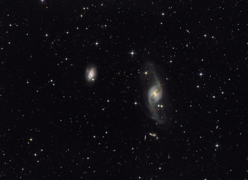 Alle Objekte im Bild sind für mich als Astrofotografen reizvoll aber nicht leicht in Szene zu setzen. Zunächst fällt die große S-Form von NGC 3718, sowie die etwas gestörte Form von NGC 3728 auf. Nachdem beide Galaxien sehr ähnliche Rotverschiebungen in ihren Spektren haben, ist davon auszugehen, dass sich beide in einer ähnlichen Entfernung von etwa 50 Millionen Lichtjahren von uns befinden. Die Distanz zwischen ihnen läge dann bei dem Durchmesser von NGC 3718 von etwa 150.000 Lichtjahren. Das ist für galaktische Verhältnisse nicht weit!