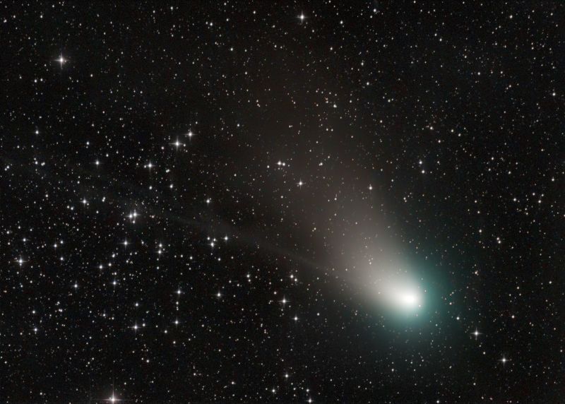 Neben dem deutlich nach oben gebogenen Staubschweif, ist auch der Ionenschweif des Kometen zu sehen, der geradewegs durch den Sternhaufen zeigt.