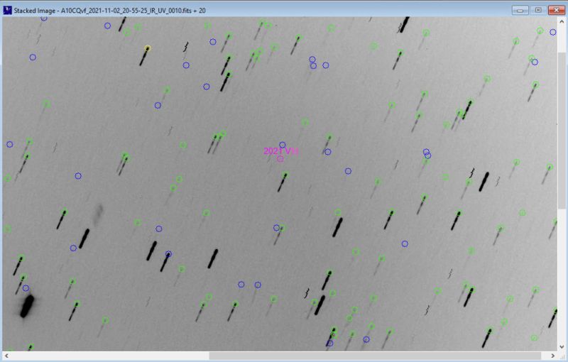 Erstmals beobachtet wurde er erst allerdings am 2.11. gegen Mittag, da war er schon wieder in sicherer Entfernung von der Erde weg. So auch bei der Beobachtung der Klostersternwarte am Abend des Allerseelentages, als 2021 VH schon wieder über 700.000 km von der Erde entfernt war. Wenn man die Größe des Asteroiden berechnet und dabei die Mondoberfläche als Helligkeit annimmt, dann kommt auf die Größe von etwa fünf Metern!