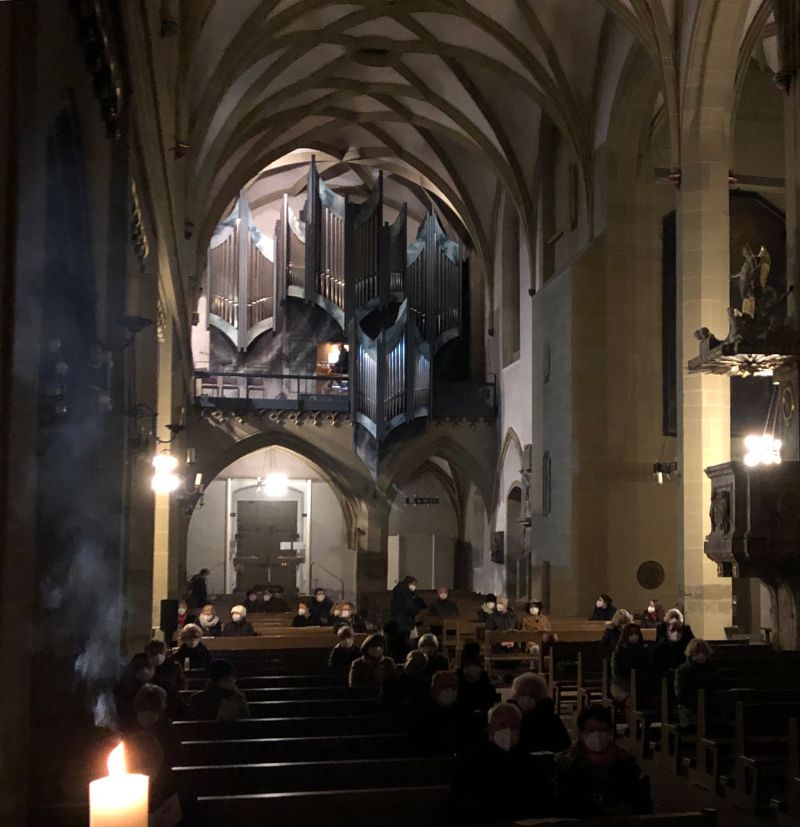 Hymnus (Dein Lob, Herr, ruft der Himmel aus), Psalm-Lied (Danket Gott, denn er ist gut), Antwortgesang, Magnificat, und Nunc dimittis in anrührender und stimmungsvoller Weise. Das kleine Ensemble von vier Stimmen füllte die große Kirche überzeugend mit ihrer differenzierten Darbietung.