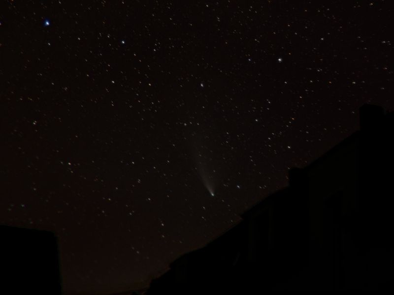 Der Komet C/2020 F3 Neowise, war schon mit seinem hellen Kopf in der späten Dämmerung zu erkennen. So bald der Mond untergegangen war, sah ich den Schweif sicher auf einer Länge von 3°-4° hinaus ragen. Fotografisch war mit einem 35 mm - 70 mm Zoom noch mehr zu erreichen.