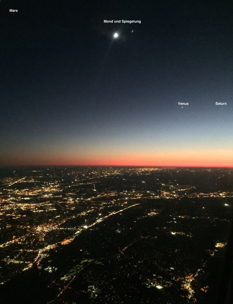 Zunächst war nur der Mond und Venus zu sehen, dann kam Mars heraus und später Saturn. Weiter in der Dämmerung waren auch andere Sterne des Schützen zu sehen (die Teekanne...), dann der Steinbock, der Südliche Fisch und der Kranich. Mit den Sternen des Mikroskops und der südlichen Krone hatte ich allerdings im Flugzeug Mühe, da nebenan jemand Zeitung las.