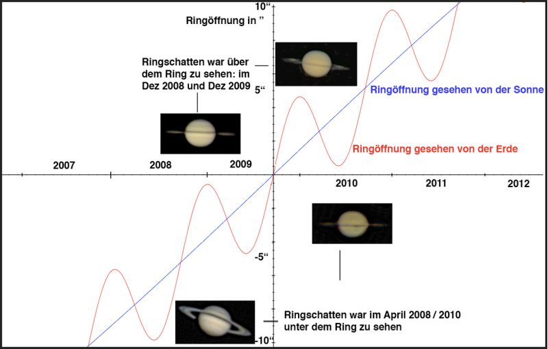 Damit ergab sich jeweils im Dezember 2008 und 2009 ein Ring, der seinen Schatten über der Ringebene zeigt. Ein etwas verstörendes Bild, da der Ringschatten ganz deutlich "neben" dem Ring liegt. Im April 2008 und 2010 hingegen konnten wir "unter" den Ring hindurch auf die Saturnkugel und damit auf den Ringschatten sehen.