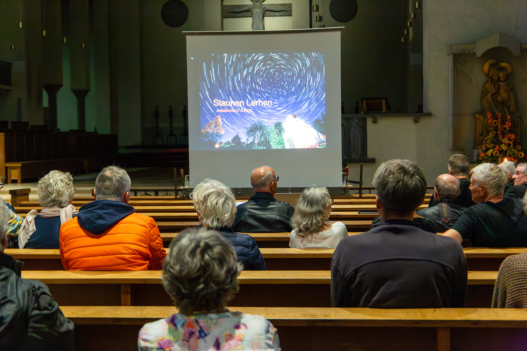 Der Abend zeigte immer wieder auf, dass sich Naturwissenschaften und Glauben nicht ausschließen müssen. Ein Kosmos voller staunenerregender Erscheinungen und Abläufen physikalischer, chemischer und biologischer Art bis hin zu uns Menschen lädt vielmehr ein, an die Schöpfung zu glauben. Gott muss es ganz groß und ganz klein, bunt, vielfältig und kreativ mögen, so das Fazit von Pater Christoph.