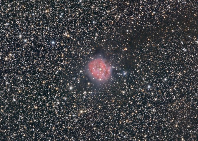 Der Name des Kokon-Nebel erschließt sich schon von seinem Aussehen her: wie in einem Kokon befinden sich neu enstandenen Sterne, die aus ihm heraus leuchten. Der Farbkontrast zwischen rötlich und bläulich schimmernden Nebelanteilen und den blauen bis gelben Sternen geben dem zentralen Feld einen eigenen Reiz.