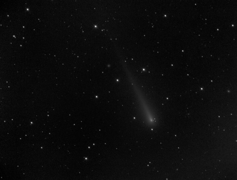 Am Morgen des 24.10.2013 konnte ich ihn allerdings lediglich gut mit einer Kamera am 10" Newton beobachten. Dort zeigt er neben einen kleinen, hellen Kern seinen Schweif auf eine Länge von etwa 20', das ist etwa 2/3 des scheinbaren Monddurchmessers. Da ISON aber in einer Entfernung von ca. 210 Mio Kilometer steht, ist sein Schweif etwa 2 Mio Kilometer lang (falls die Perspektive nicht verzerrt ist). Sein Kern wird lediglich auf 4 Kilometer Größe geschätzt!