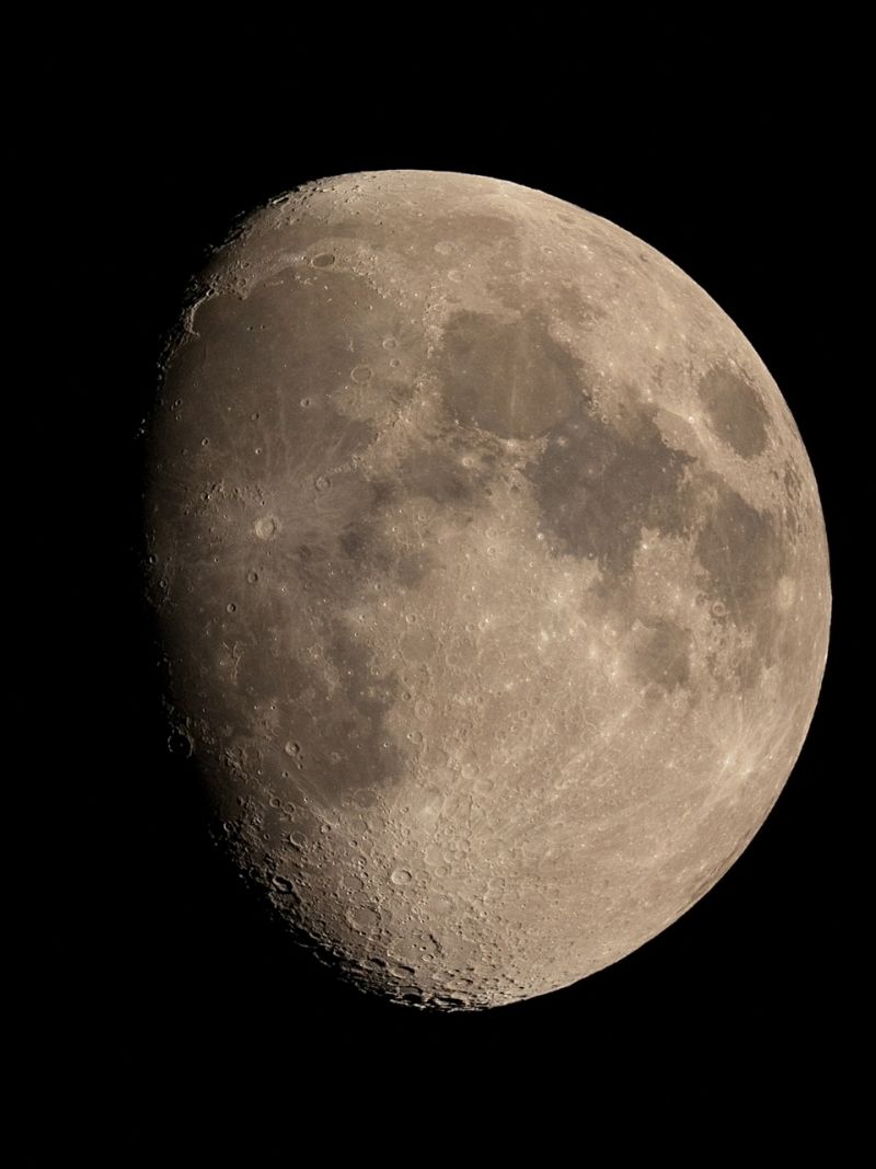 Sehr gut sind sowohl die großen, dunkleren Mare ("Meere") des Mondes teils mit den zerklüfteten Kraterlandschaften um sie herum zu erkennen. Dabei sind die kleinsten Krater nur wenige Kilometer im Druchmesser. Manchmal sitzt auch ein kleinerer Krater auf einem größeren bzw. in einem anderen. Langgezogene Täler werden als helle Spuren deutlich und konzentrische Strahlen um die großen Krater erzählen etwas von ihrer Entstehungsgeschichte. Am Mondrand sind kleine Unregelmäßigkeiten zu erkennen. Es sind Berge, die mindestens zwei oder mehr Kilometer in die Höhe ragen und die wir im Profil sehen können.