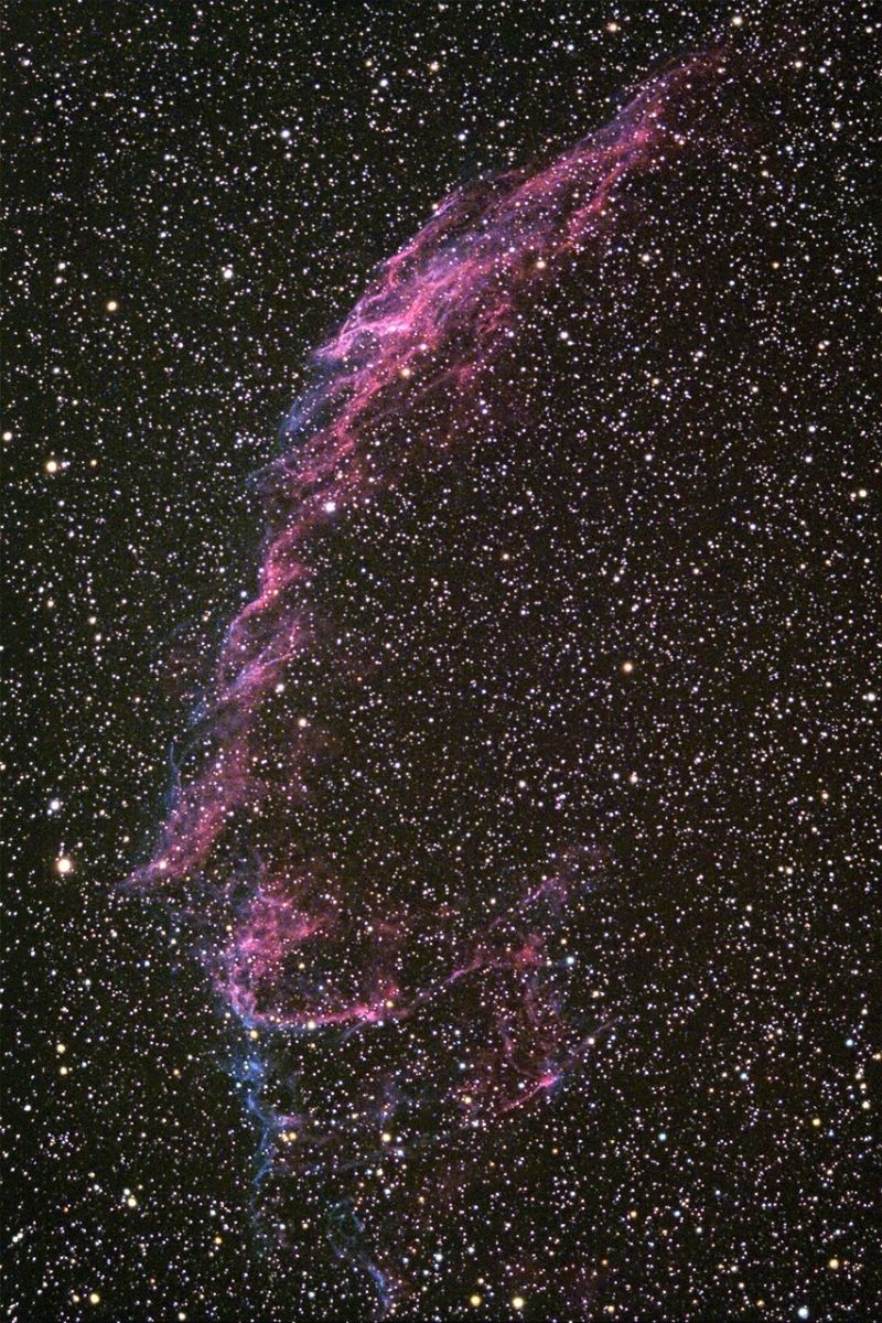 treibt im Sternbild Schwan auseinander. Da er mit irdischen Cirrus-Wolken eine Ähnlichkeit hat, wurde er nach ihnen als Cirrus-Nebel benannt. Dabei ist im hoch aufgelösten Bild nur der östliche Teil festgehalten. Insgesamt umfasst der Cirrusnebel einige Durchmesser des Vollmondes am Himmel und ist nur mit einem Tele-Objektiv zu erfassen, wie auf einer Aufahme aus dem Jahre 2010. Der Nebel entstand aus einer Supernova-Explosion vor über 15.000 Jahren und treibt seither auseinander und steht in einer Entfernung von 1.500 Lichtjahren in unserer weiteren galaktischen Nachbarschaft.