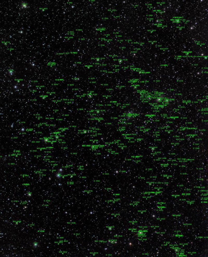 Das Bild umfasst eine Fläche von etwa 8°x10°. Selbst in einem Feldstecher fallen in einer dunklen Nacht ohne Mond und Streulicht zahlreiche Galaxien schon auf. Mit einem größeren Teleskop können mehrer hundert Galaxien im Feld gefunden werden. Es wimmelt nur noch so von "Fizzelchen".