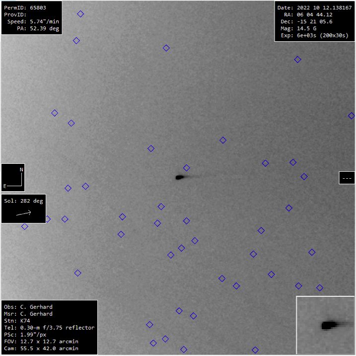 Im Bild oben am Morgen des 12.10.2022 ist Didymos / Dimorphos mit einem langen Staubschweif zu sehen. Er ist von der Sonne weg gerichtet und hat mittlerweile über 5' im Bild, was an die 20.000 km entspricht. Durch den Strahlungsdruck des Sonnenlichts wird der Staub von der Sonne (links in der Mitte des Bildes mit einem Pfeil und Winkel angezeigt) weg gedrückt.