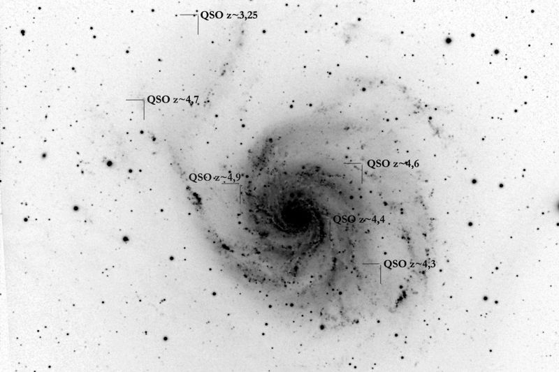 In meinem Bild von M101 fand ich nun Objekte mit Rotverschiebungen, die höher als 3 liegen. Das meint, dass sie ihr Licht aussandten, als das Universums weniger als 1/4 des derzeitigen Durchmessers hatten. Die Laufzeiten für das Licht ergeben sich damit zu über 12 Mrd. Jahren! Was allerdings mit den Objekten heute ist, das entzieht sich völlig unserer Kenntnis, denn wir sehen sie in ihrem schon sehr lange vergangenen Zustand.