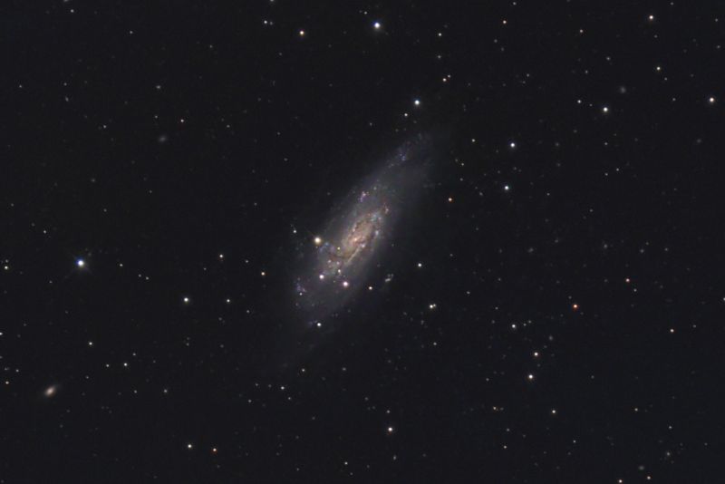 hat mich wegen ihrer Ähnlichkeit zur M66 zu einer Fotografie angeregt. Neben der Galaxie geriet mir dabei zufällig auch ein hoch rot verschobener Quasar ins Bild. Das unruhige und sehr abwechslungsreiche Aussehen der Welteninsel, mag von der bewegten Geschichte der Galaxie erzählen. Viele Sternentstehungsgebiete mir ihren roten und blauen Verdichtungen zeugen von einer hohen Sternentstehungsrate in der Galaxie. Die Spiralstruktur ist deutlich ungleichmäßig und zeigt in ihren Dunkelstrukturen einige "Abzweigungen" und Verbiegungen. Der nördliche Außenbereich ist deutlich verzogen gegenüber dem südlichen mehr rundlichen Teil.