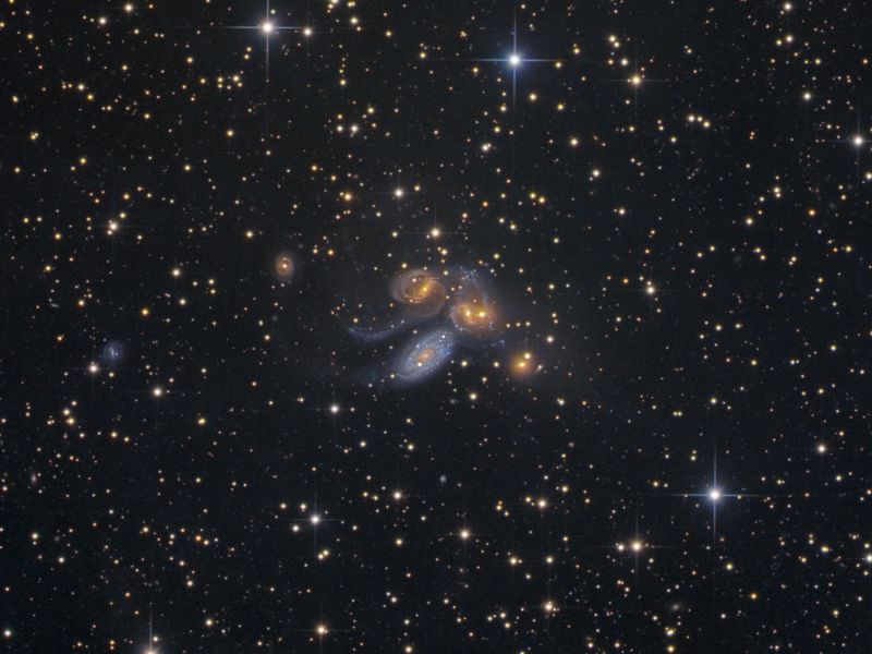"Rund 30 Bogenminuten südwestlich der großen Spiralgalaxie NGC 7331 im Pegasus befindet sich die enge Galaxiengruppe namens Stephans Quintett (engl.: Stephan´s Quintet). Entdeckt wurde diese Galaxiengruppe 1877 durch den französischen Astronomen Édouard Jean-Marie Stephan. Er war Direktor der Sternwarte in Marseille. Das heutige AdW zeigt diese Galaxiengruppe mit Norden oben und Osten links, Bildmaßstab: 0,541 arcsec/px, Bildfeld: 31,3' x 23,5'. Sehr schön ist die Entstehungsgeschichte dieses Bildes: Schüler der naturwissenschaftlichen Schwerpunktklassen des Würzburger Friedrich-Koenig-Gymnasiums um Christian Lorey haben im August 2018 mehrere Nächte Stephans Quintett aufgenommen (ab jetzt SQ genannt).