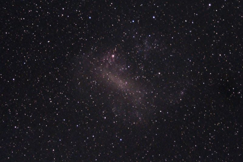 Die Große Magellansche Wolke (GMC) ist eine der kleineren Begleitgalaxien unserer Milchstraße. Sie ist mit etwa 160.000 Lichtjahren uns sehr nahe und erscheint daher auch über einige Grad erstreckter Balken am Nachthimmel mit dem bloßen Auge (dunkler Himmel vorausgesetzt). Zahlreiche Einzelobjekte wie der Tarantelnebel, ein großes Sternentstehungsgebiet, lassen sich auf dem Bild ausmachen (oben, links von der Mitte). Auch weit verstreute blaue Sternhaufen können auf dem Bild ausgemacht werden, wenn auch die Auflösung in Einzelsterne bei der kurzen Brennweite nicht gelingen kann. Am dichtesten von Sternen besiedelt ist der Balken der nicht ganz regulären Galaxie.