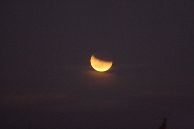 erkämpfte sich wieder - wie diejenige im Sommer diesen Jahres - ihre Sichtbarkeit nur mühsam gegen die Wolken am Himmel. Als aber der Mond aus den irdischen Hindernissen kam, war wenigstens der Abschluss des Schauspiels zu beobachten. Wie im Sommer ging auch diesmal der Mond schon verfinstert auf, bzw. seine totale Verfinsterung endete schon beim Aufgang an unserem europäischen Horizont. Aber da standen erstmal eine satte Wolkenbank davor in Münsterschwarzach. Erst als der Mond schon 3° über dem Horizont war, konnte ich ihn beobachten.