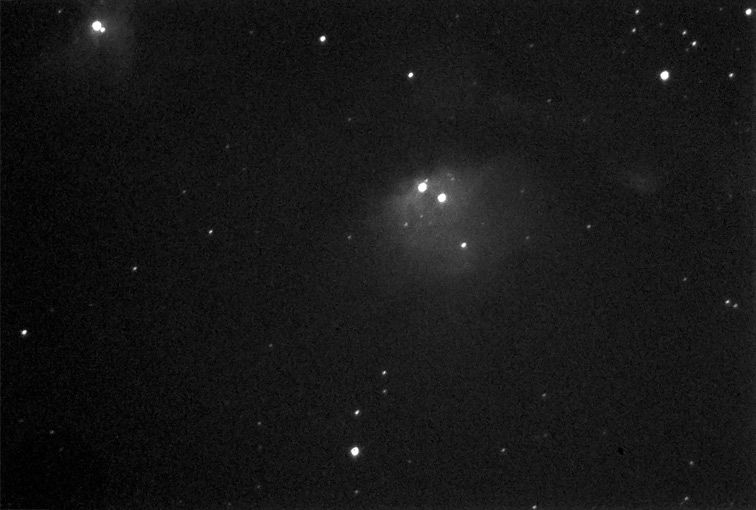 Am 13.3. habe ich mit einem 80/400 mm Refraktor und einer Webcam für Langzeitbelichtung experimentiert. Die Genauigkeit entspricht dabei ungefähr einer halben Zeitsekunde oder +- 3 Bogensekunden in der Abbildung. Dieser Wert ist für die eingesetzte Brennweite von 800 mm eigentlich zu schlecht. Aber da das Wetter noch ungeeigneter war mit durchziehenden Wolken habe ich das Teleskop einmal damit laufen lassen. Ziele waren M78, ein Reflexionsnebel mit Staub und Gas und der bekannte Orionnebel. Es kamen für die Umstände verblüffend gute Ergebnisse heraus.