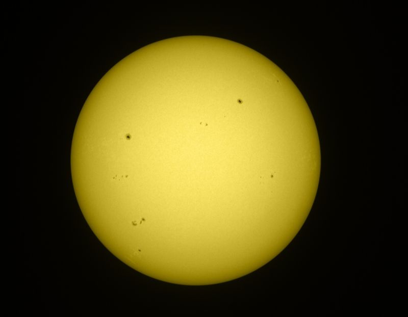 Dabei waren gestern nicht nur die beiden großen dicken Sonnenfleckengruppen im Norden zu erkennen, sondern auch zahlreiche andere lockere und kleinere Gruppen von Flecken. Gebiete in denen sich "Schlieren" zu bilden scheinen sind ebenso zu erkennen, wie die körnige Oberfläche, die Granulation der Sonne.