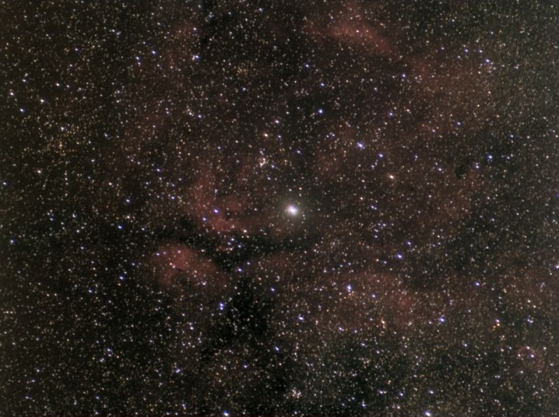 haben mich für eine länger belichtete Aufnahme gereizt. Dabei sind die roten Wasserstoffwolken Bestandteil unserer Milchstraße, aus denen bald neue Sterne entstehen können. Auch der kleine Nebel direkt um Gamma Cygnis ist erkennbar als eine helle Blase um den Stern selbst (also ist kein Lichthof vom Objektiv). Am auffälligsten ist der doppelte Nebel links von Gamma Cygni, der Ähnlichkeit mit einem Schmetterling hat: IC 1318. NGC 6910 ist ein offener Sternhaufen, der gedrungen vor dem Hintergrund der Milchstraße auffällt. Der Mondsichelnebel oder Crescent-Nebel, NGC 6888 ist rechts unten in der Ecke zu finden und schließlich M29, ein kleiner offener Sternhaufen mit wenigen Sternen in der Bildmitte unten.