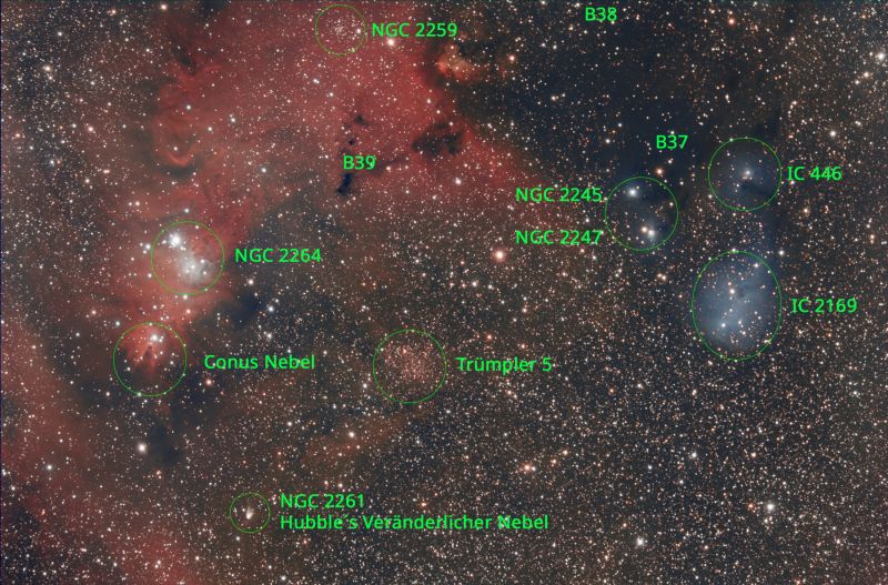 Mit im Bildfeld sind eine Reihe kleinere, unscheinbare Sternhaufen: NGC 2259 oder Trümpler 5.