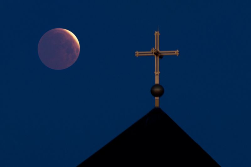 Das alles zeigt sich mir im Bild von der Mondfinsternis (sie steht für das Weltall) und dem vergoldeten Kreuz des Saint Benedict Centers in Nebraska (ein Symbol unserer Erlösung aus allem Leid, Kreuz und Tod und das alle Himmeilsrichtungen umfängt).