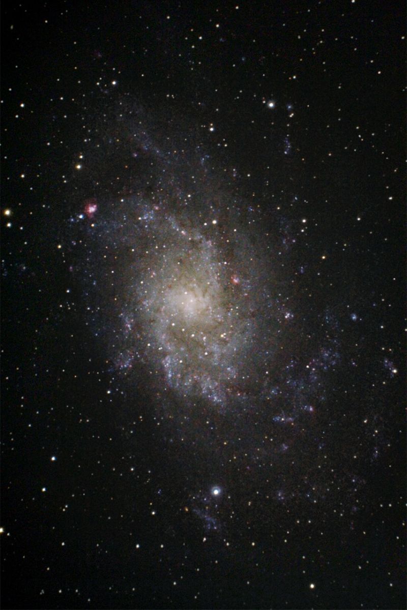 Die Aufnahmen von M33 stammen noch aus dem letzten Jahr. Bislang lagen die Bilder noch "unter"-entwickelt auf der Festplatte. Ein erster Versuch war nicht sehr verheißungsvoll, so blieben sie zu Unrecht liegen. Mit einem neuen Verfahren, das die Farbigkeit der Canon-Bilder wesentlich besser wieder gibt, kam ein ansprechendes Ergebnis zustande.