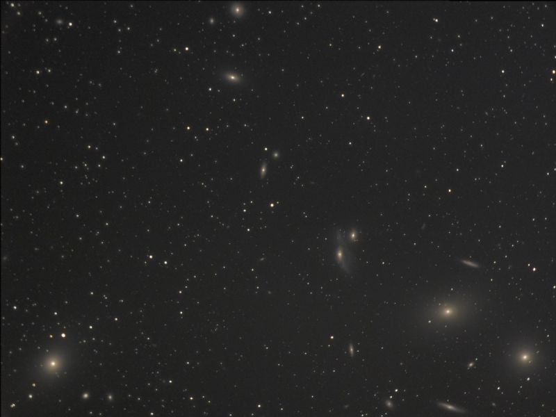 im Sternbild der Jungfrau ist ein Ziel im reichen Galaxienhaufen in der Jungfrau. Zwanzig und weit mehr Galaxien können auf dem Bild gefunden werden. Dabei sind echte Schwergewichte dabei. Links unten beginnt es mit M87 der zentralen Galaxie des Virgo-Galaxienhaufens. Über 2 Billionen Sonnenmassen sind in ihr zusammen geballt. Im Zentrum sitzt ein Schwarzes Loch mit etwa 7 Milliarden (!) Sonnenmassen. Sie zählt damit zu den größten elliptischen Galaxien.