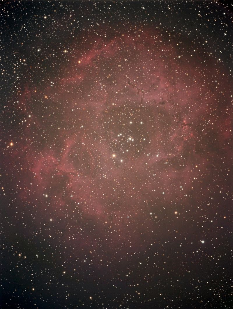 oder einfach astronomisch NGC 2244 mit NGC 2237, NGC 2238, NGC 2239 und NGC 2246 ist ein reizvolles Ziel am Wintersternenhimmel. Der offene Sternhaufen (oder die Sternhaufen im Plural) beleuchten dabei eine große Wasserstoffwolke, aus der sie entstanden sind. Dabei leidet die Rose in der Beachtung durch die unmittelbare Nachbarschaft zum Großen Orionnebel. Allerdings ist sie nicht kleiner als dieser, sondern eher größer. Der Rossettennebel ist reich an Sternhaufen und auch interessanten Dunkelwolken, wobei letztere nur auf Fotografien deutlich in Erscheinung treten.