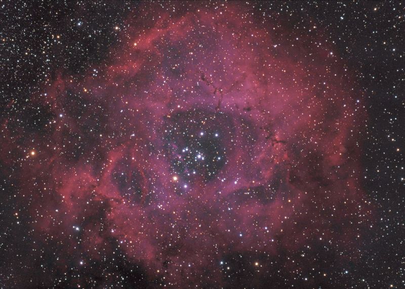 Im unscheinbaren Sternbild Einhorn, das östlich des Orions liegt, befindet sich der Rosetten-Nebel. Er ist einer der vielen Sternentstehungsgebiete in der Wintermilchstraße, dessen Ausmaße über mehrere Vollmondurchmesser beträgt. Visuell ist weniger der Nebel zu erkennen, sondern der aus den Wasserstoffwolken entstandene junge Sternhaufen.