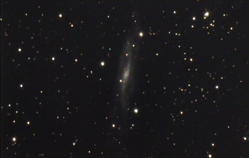 Heraus kam NGC 7640, eine Balkenspirale, die wir fast von der Kante sehen. Das Teil ist nicht besonders prominent und deshalb fand ich auch wenig Informationen zu der Galaxie. Sie ist ca. 25 Mio Lichtjahre entfernt und sie ist relativ schwach von ihrer Flächenhelligkeit her. Eine entzerrte Version des Bildes zeigt das schöne geschwungene "S" der Spiralarme, die sich über 180° um den Galaxienkern winden. Allerdings ist dieser nicht doppelt, das ist ein Artefakt des Staubbandes, das in der unverzerrten Aufnahme vor dem Kern liegt.