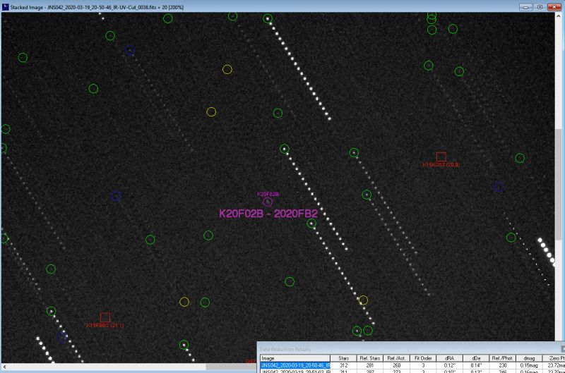 Beim Addieren von 20 Einzelbildern mit nur je 10 Sekunden Belichtungszeit, in der vermuteten Bewegungsgeschwindigkeit des neu entdeckten Himmelskörpers, trat er im Summenbild deutlich zu Tage (siehe Bild oben). Die Sterne "verziehen" sich dabei zu Strichspuren, währenddessen der Asteroid still zu stehen scheint als einzelnes Pünktchen. Die Position konnte so besser bestimmt werden und an das Minorplanetcenter übermittelt werden. Die Genauigkeit der Daten waren besser als 0,5", was zu einer verbesserten Bahnberechnung für den Asteroiden half. Es steht nun sicher fest, dass von diesem Körper in den nächsten Jahrzehnten keine Gefahr für uns auf der Erde ausgeht.
