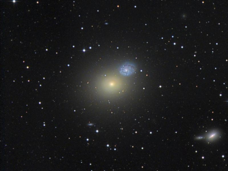 NGC 4637 / NGC 4638: das Galaxienpaar liegt zwischen den beiden großen Galaxien, ist aber auch ein Teil des Virgo-Galaxienhaufens und damit rund 60 Millionen Lichtjahre von uns entfernt. Dabei handelt es sich tatsächlich um ein interagierendes Paar kleinerer Galaxien. Ähnlich liegt auch der Fall bei bei dem Paar rechts oben in der Bildecke: bei NGC 4606 und NGC 4607.