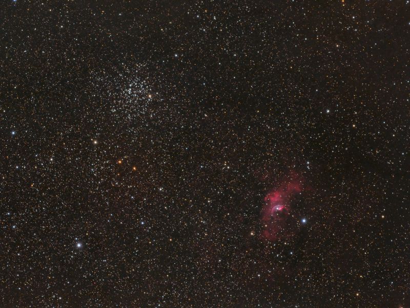 Etwa 5000 Lichtjahre von uns entfernt liegt der Sternhaufen Messier 52, der aus über 500 Sternen besteht. Sein Alter ist etwa 100 Millionen Jahre und ist damit noch eine junge Erscheinung unserer Heimatgalaxie. Wesentlich jünger ist der Bubble-Nebel. Er hat sich erst in den letzten Jahrmillionen gebildet und leuchtet in rot, blau und in Magenta-Tönen. Die Blase selbst ist etwa 7000 Lichtjahre von uns entfernt und wird von dem jungen heißen Stern oberhalb der Mitte der Blase gebildet. Der rote, riesige Wasserstoffnebel um NGC 7635 wird in den nächsten Millionen Jahren einen neuen Sternhaufen bilden.