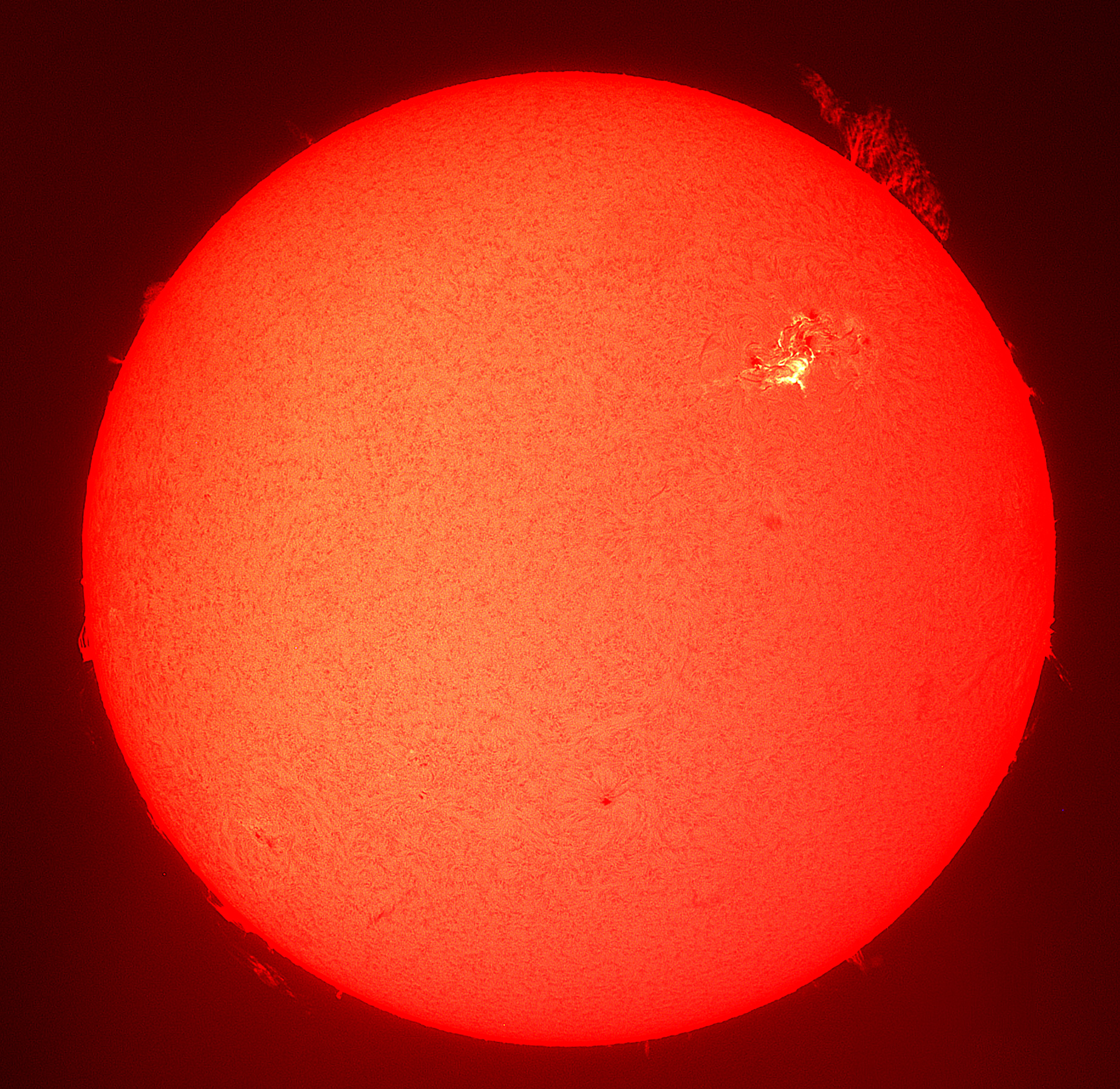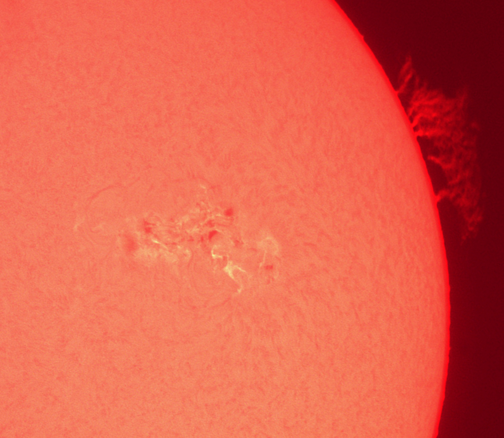 Am 10. Mai ist die gesamte Sonne mit vielen Protuberanzen ins Bild gesetzt. Die Fleckengruppe leuchtet sehr hell und intensiv.