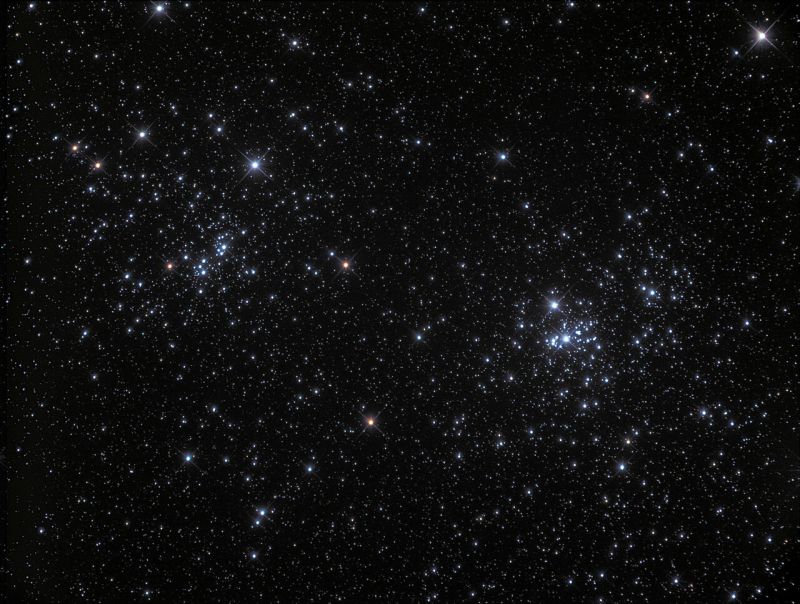 ein wunderschöner Doppel-Sternhaufen war mit den Sternschnuppen der letzten Tage am Morgenhimmel zu bewundern. Nur der helle Mond und vor allem durchziehende Wolken behinderten den Blick. h und chi sind zwei eng beieinander stehende Sternhaufen im Sternbild Perseus. Ihre Bezeichnung mit griechischen Buchstaben deutet schon auf ihre "Entdeckung" hin: Hipparch hat sie schon im Altertum in seine Sternkarten aufgenommen. Die beiden sind schon mit dem bloßen Auge zu erkennen und mit einem Feldstecher in Einzelsterne aufzulösen. In einem Teleskop zeigt sich bei kleinen bis mittleren Vergrößerungen die ganze Schönheit der Sternhaufen im doppelten Glanz mit roten und vor allem blauen Sternen unterschiedlichster Helligkeiten.