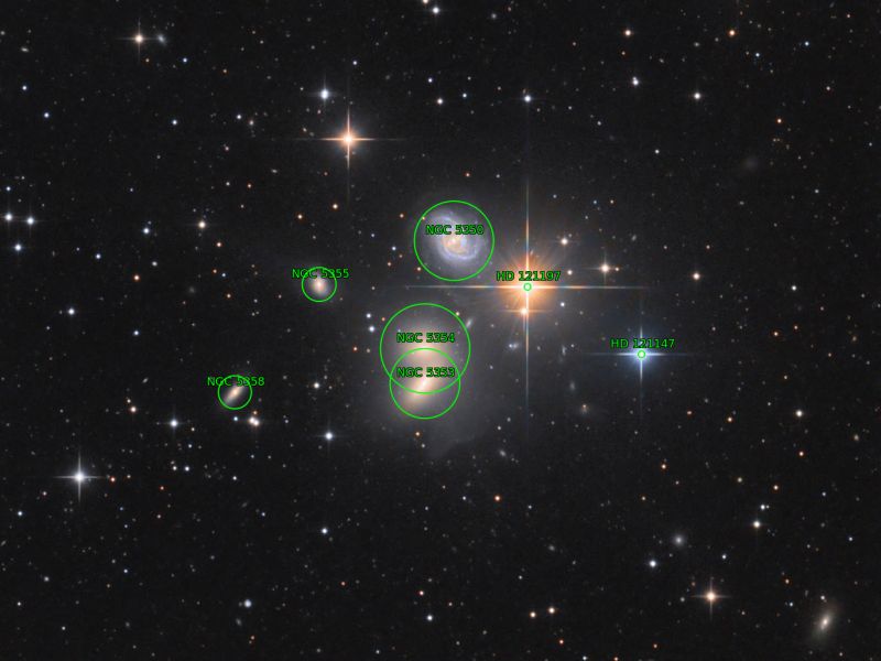 Die Galaxie NGC 5350 bildet mit ihren kleineren Begleitern NGC 5355, 5358 und die beiden NGC 5354 und 5353 (letztere stehen sehr eng beieinander und haben einen regelrechten Halo um sich) eine sehr schöne Konstellation. Sie ist auch unter der Katalogbezeichung Hickson 68 bekannt. Ein Leckerbissen für alle Galaxienfans!