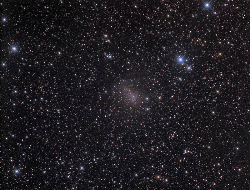 IC 10 ist eine kleine irreguläre Galaxie der lokalen Gruppe und etwa so weit entfernt wie die Andromedagalaxie. Sie steht mitten in der Milchstraße und wird durch vorgelagerten Staub stark gedämpft und gerötet. Nachdem ich in einer wunderbar klaren Nacht im August den Luminanzkanal (sw-Bild) aufnehmen konnte, musste ich auf eine Gelegenheit für die Farbaufnahmen über zwei Monate warten. Endlich Anfang Oktober war es so weit, dass ich auch Farbe ins Bild bringen konnte.