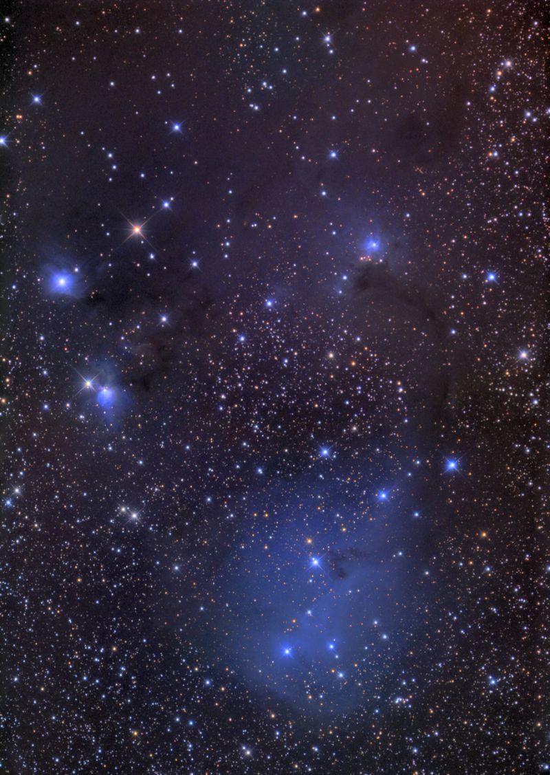 Spontan titulierte ich den großen Nebel IC 2169 als "blauen Kartoffelsack", wegen seiner Farbe und unförmigen Gestalt. Der anschließende Dunkelnebel, der nach oben führt, könnte so etwas wie sein zugebundenes Ende sein. Dort schließt sich dann der helle Nebel IC 446 mit IC 2167 an. Ähnlich wie der große blaue Nebel reflektiert auch hier Gas und Staub das blaue Licht der jungen Sterne, die vor astronomisch kurzer Zeit (einige Jahrmillionen) in der Milchstraße entstanden sind. Links im Bild sind dazu die beiden Reflexionsnebel NGC 2243 und 2245 zu finden.