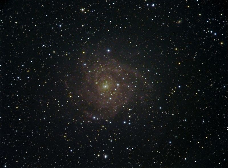 "Spinnengalaxie" im unscheinbaren Sternbild Giraffe. In den Morgenstunden steht diese Galaxie über unseren Köpfen im Zenit Richtung Norden. Das ist die richtige Zeit, um die schwierig zu beobachtende Galaxie ins Bild zu setzen. Visuell verbirgt sie sich in den Sternen der Milchstraße und ist dadurch schwierig zu erkennen. Kaum mehr als ein runder Schein hinter den Sternen ist auszumachen. Aber nicht nur die Sterne unserer Heimatgalaxie machen IC 342 zu schaffen, es ist auch der galaktische Staub, der ihr Licht um das zehnfache abschwächt. Wäre der nicht da, die Galaxie wäre etwa so hell wie M33.