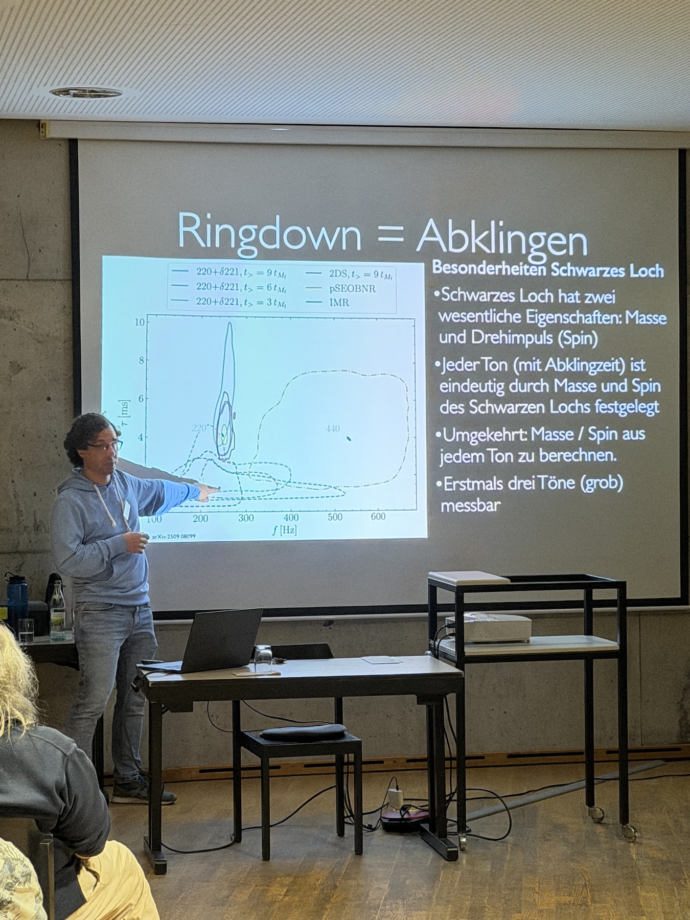 Nach der Eucharistiefeier am Abend, nahm uns Benjamin Knispel in das Reich der Gravitationswellen mit. Sie erlauben neue Einblicke in die unsichtbare Welt der Raumzeit und ihrem Zittern. Vielleicht können schon in den nächsten Jahren und die Gravitationswellen-Detektoren einen völlig neuen Einblick in die Zeit kurz nach dem Urknall gewähren, der uns heute aufgrund der kosmischen Hintergrundstrahlung noch unzugänglich ist.