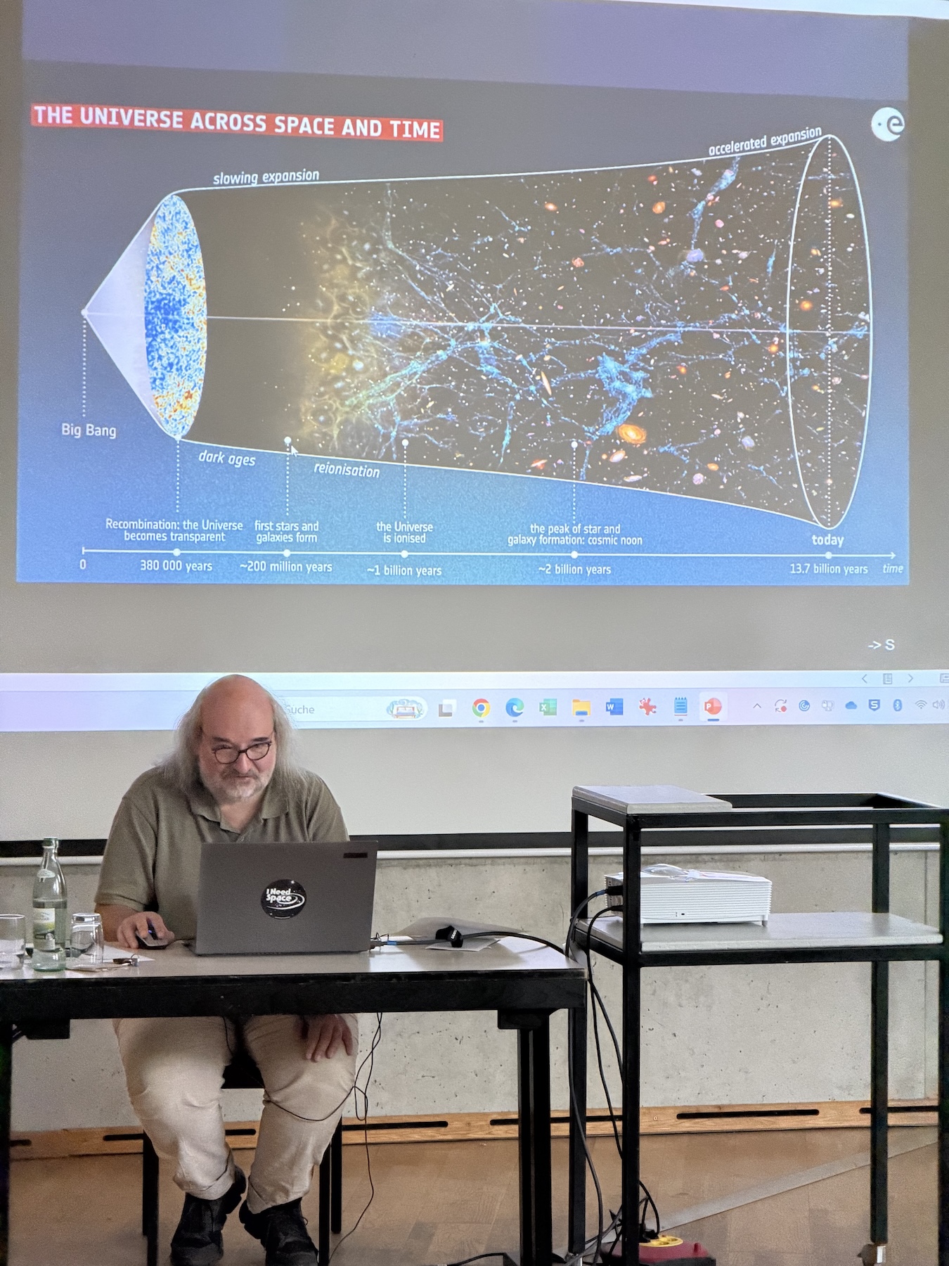 Dann ging es in die Tiefen des Weltraumes: 10 Mio Lichtjahre, 100 Mio Lj, und so weiter und so fort - bis ans Ende des Weltraumes bei, - 13,5 Mio Jahren Lichtlaufzeit, oder besser bezeichnet mit der Rotverschiebung von z≈14 oder gar z≈25? Daniel wagte sich an die neuesten und heiß diskutierten wissenschaftlichen Paper heran, die neueste Beobachtungen des JWST zu interpretieren suchen.