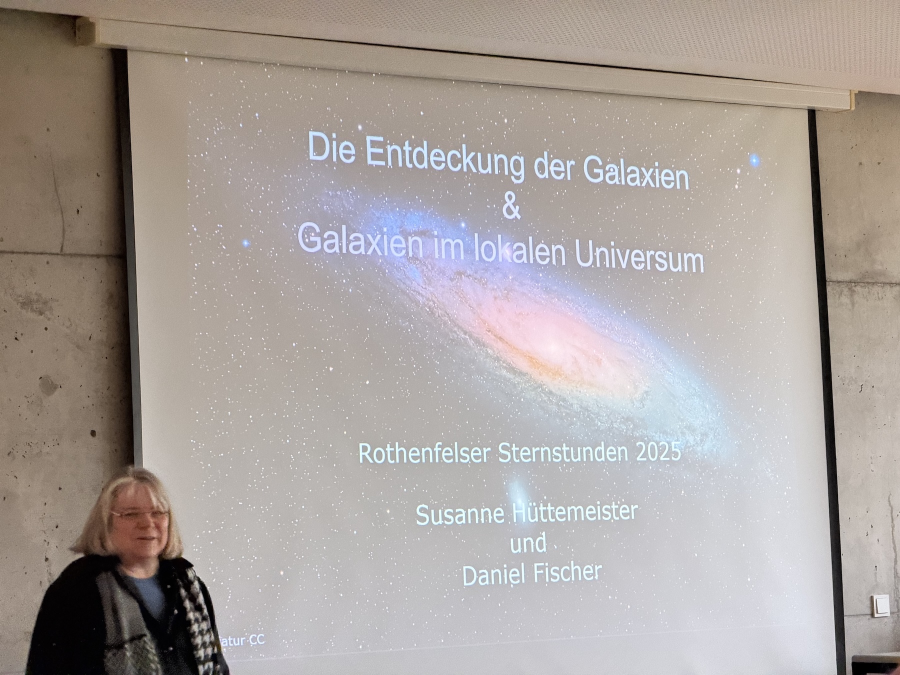 Nach diesen Vorbereitungen betraten Susanne Hüttemeister und Daniel Fischer das Reich der Galaxien. In ihrer begeisternden und fachlich überaus kompetenten Art führten sie in die Forschung der Galaxien ein. Sie begannen mit den vielen verschiedenen Formen von Galaxien und ihrer Klassifizierung. Edwin Hubble führte ein Schema ein, die Galaxien in Spiralen, Spiralen mit einem zentralen Balken wie die Milchstraße oder strukturlos erscheinende elliptische Systeme einordnete.