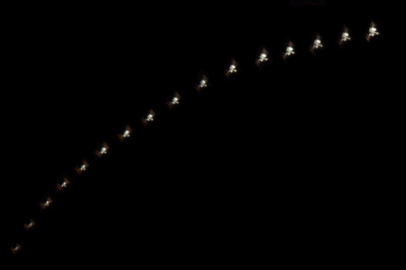 Die Größe der ISS ist mittlerweile auf etwa ein Fußballfeld angewachsen. Vier große Solarzellenmodule versorgen sie mit Energie. Sie sind auf den Einzelbildern gut zu sehen. Mit ihnen wird auch die Drehung der ISS beim Überflug deutlich. Von den Hauptmodulen sind die wichtigsten zu sehen: die amerikanischen, die europäische und japanische Module für Versuche auf der ISS und das Modul für die Unterbringung.