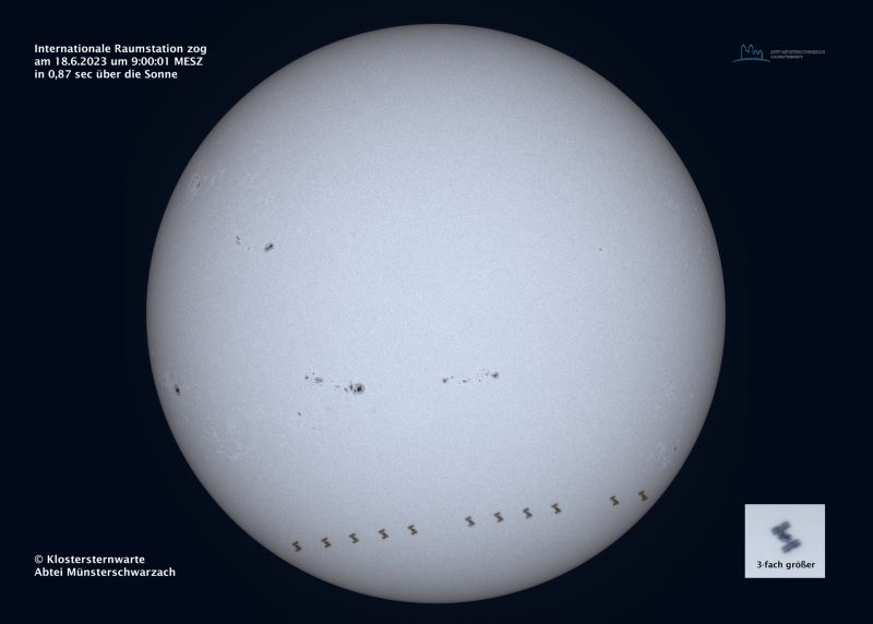 Am 18.6.2023 um 9:00:11 MESZ flog die Internationale Raumstation von der Klostersternwarte in Münsterschwarzach aus gesehen vor der Sonne vorbei. Der Transit dauerte gerade einmal 0,87 Sekunden! Mit Sonnenfilter vor dem Teleskop und einer CMOS-Kamera dahinter gelangen gute Aufnahmen des Geschehens.
