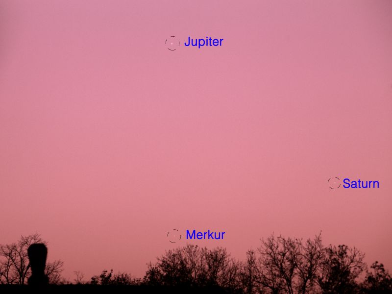 Zu Jahresbeginn gaben sich gleich drei Planeten ein Stelldichein am Abendhimmel: Jupiter, Merkur und Saturn standen am 10.1.2021 gegen 17 Uhr MEZ tief im Südwesten in einem Umkreis von 1,5° (etwa der dreifache Monddurchmesser) zusammen. Mit bloßem Auge war es nicht so einfach, die Planeten zu sehen. Jupiter und Merkur gingen noch mit viel Glück, doch für Saturn brauchte es die Fotografie.