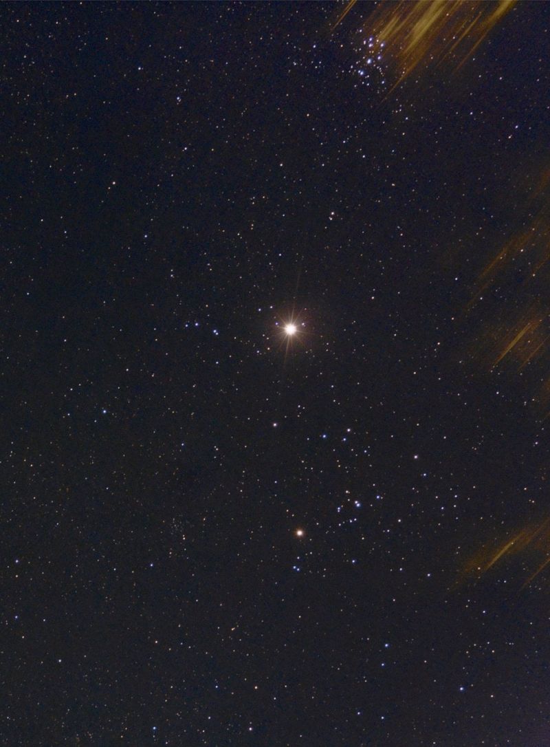 Das Tor wird dabei von zwei prominenten Sternhaufen gebildet: den Plejaden und den Hyaden. Die Plejaden sind auch bekannt als das Siebengestirn, das oberhalb von Jupiter zu finden ist. In einer mondlosen und dunklen Nacht kann man ohne weiteres sieben oder gar mehr Sterne sehen. Manch einer hält auch die Plejaden für den kleinen Wagen aufgrund der Anordnung der Sterne.