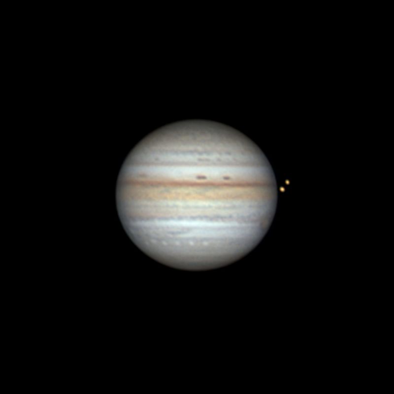 Hinzu kam glücklicherweise am Beobachtungstag noch zwei weitere wichtige und schöne Zufälle: das Seeing war für Münsterschwarzacher Verhältnisse schon fast ausgezeichnet gut und der Große Rote Fleck befand sich gerade auf der Erd zugewandten Seite des Planeten.