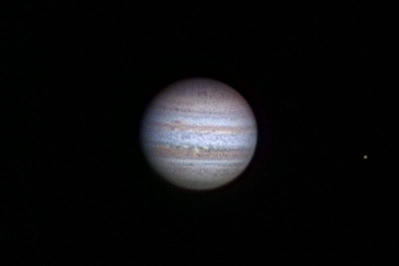 Jupiter ist mit 40" schon mehr als 1/10 kleiner als zu seiner Zeit der Opposition vor einigen Monaten. Dennoch sind viele Details seiner Atmosphäre zu erkennen und auffällig zu beobachten.